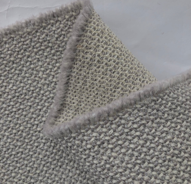 1,0m lang 1.4m breed en een apart stuk van 1,35m breed en 0,7m lang, 95% wol, 5% polyacryl, kleur grijs ecru luxe meubelstof met rek, winkelprijs is 138 euro per meter