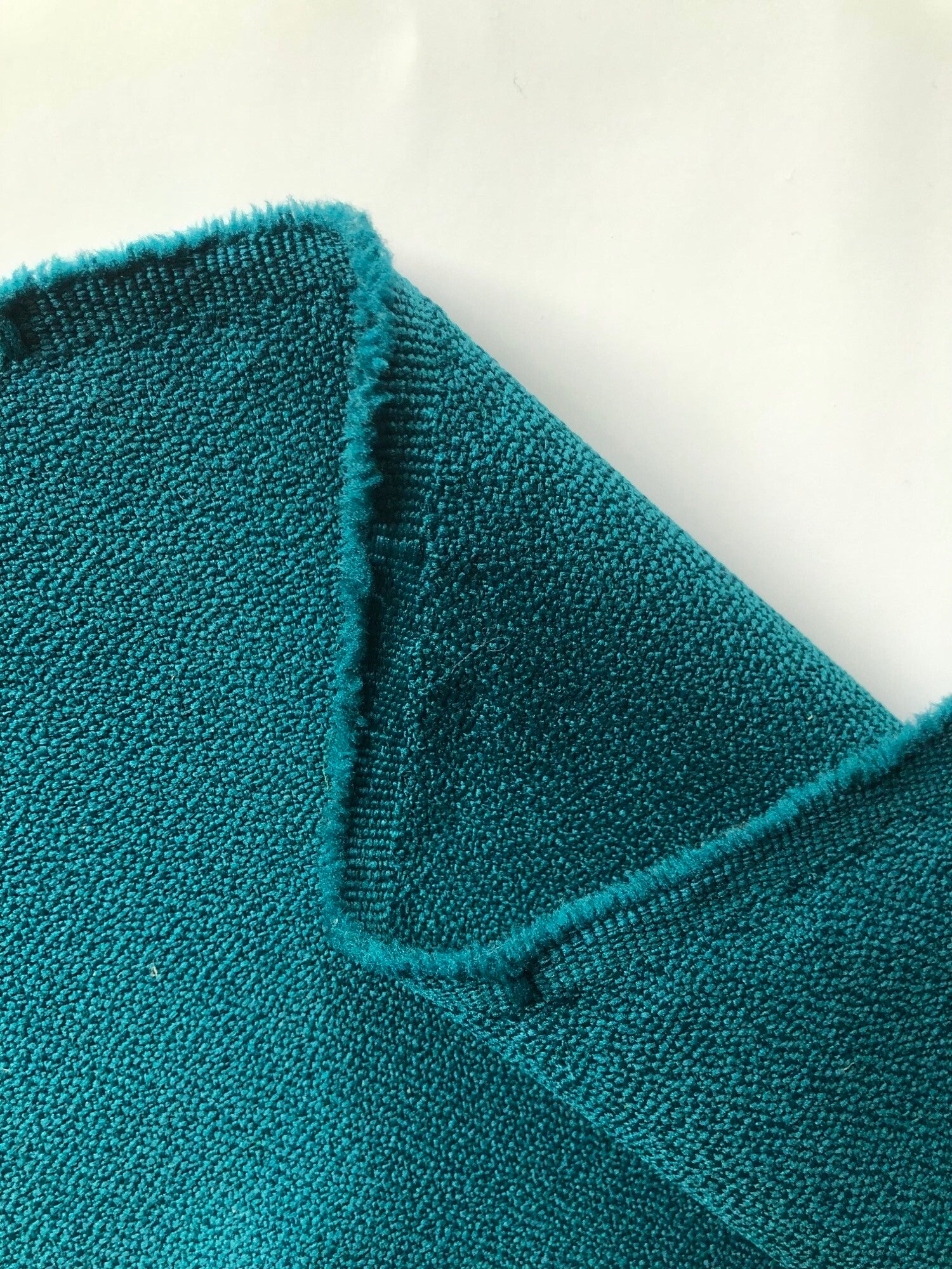 0,54m lang 1,45m breed met een stuk er aan van 0,93m breed en 2,10m lang, soepele polyester crepestof (Gabriel?) donker turqoise