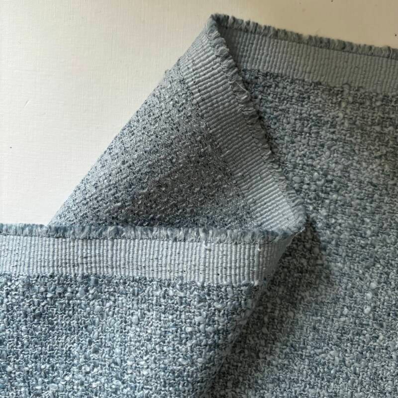 3,5m lang 1,4m breed, 100% polyester, soepel stof, blauw gemeleerd, iets boucle-achtig