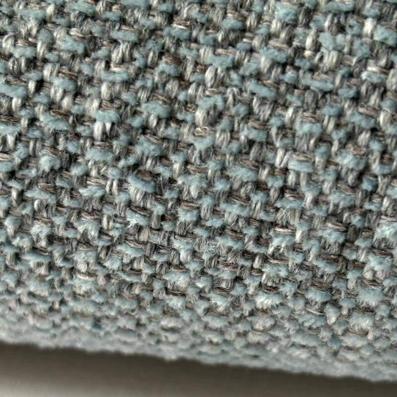 1,6m lang 1,4m breed met een stuk er aan van 0,8m breed en 0,7m lang, 100% polyester, 40% recycled winkelprijs is 88 euro per meter. Blauwgrijs
