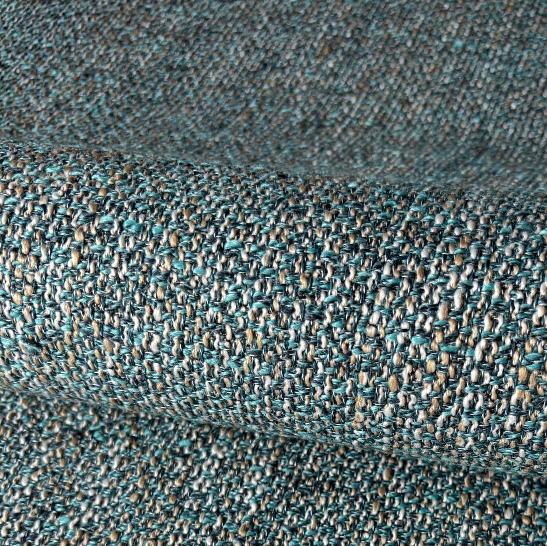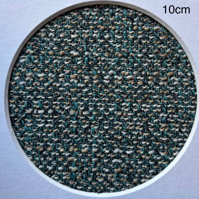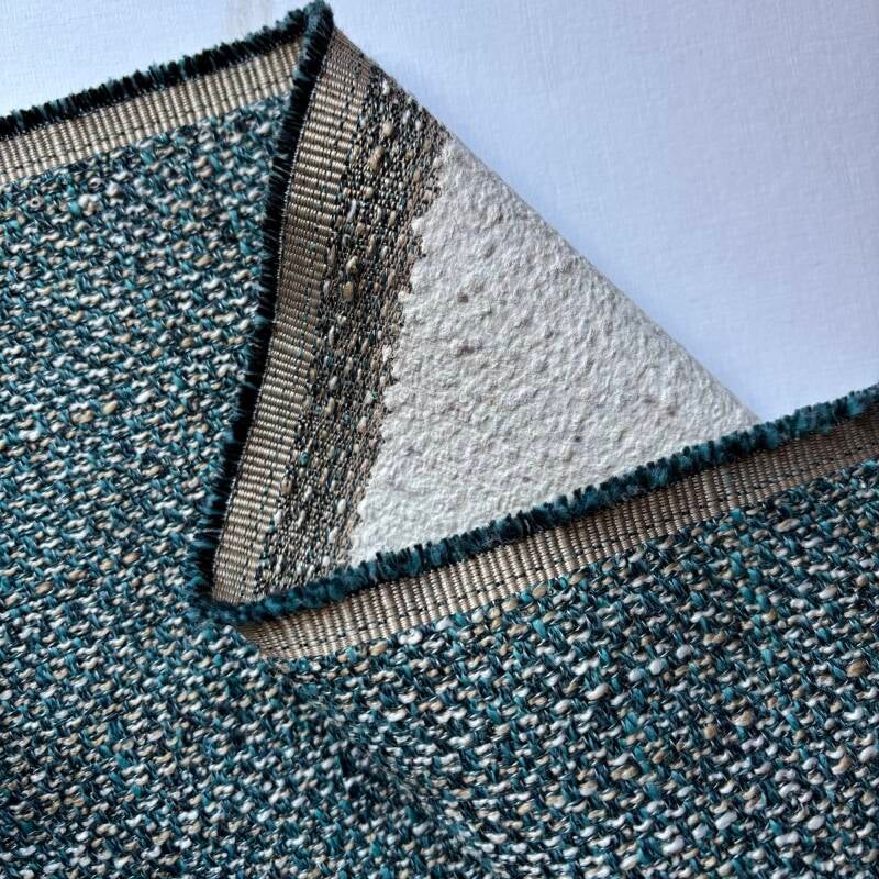 2,7m lang, 1,4m breed met een stuk er aan van 0,75m breed en 1,5m lang, stevige grofgeweven meubelstof op waterdichte rug blauw groen.