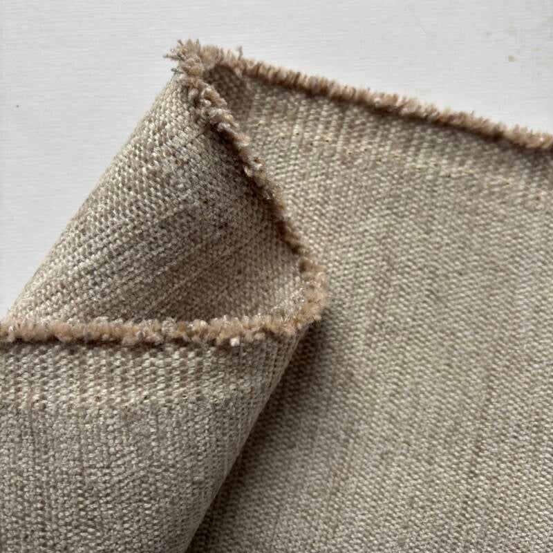 5,1m lang, 1,5m lang met een stuk er aan van 1,35m breed en 0,6m lang, 75% katoen, 25% polyacryl, winkelprijs is 82 euro per meter sterke chenille creme gemeleerd