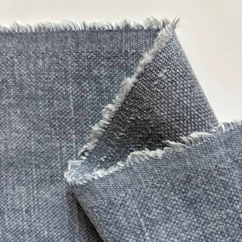 4,3m lang, 1,4m breed, 60% katoen, 40% linnen, comfortabele soepele meubelstof blauwgrijs