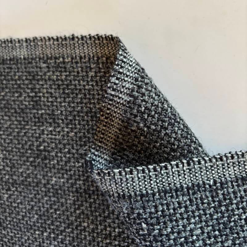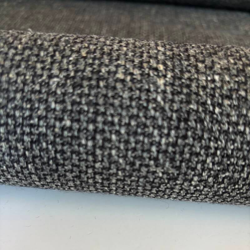3,7m lang, 1,4m breed, 65% wol, 31% hemp, 4% polyamide, grijs zwart gemeleerd