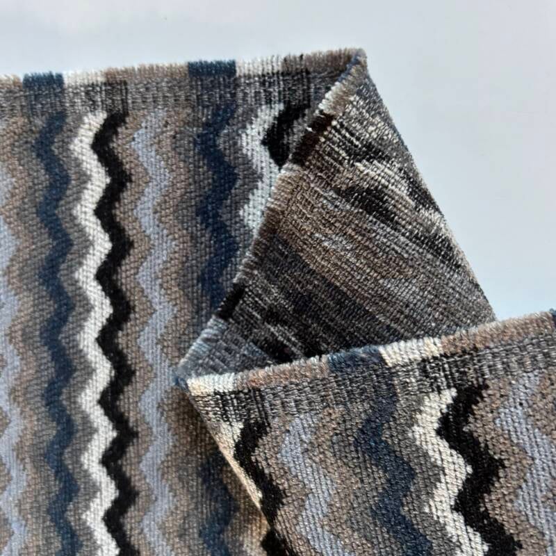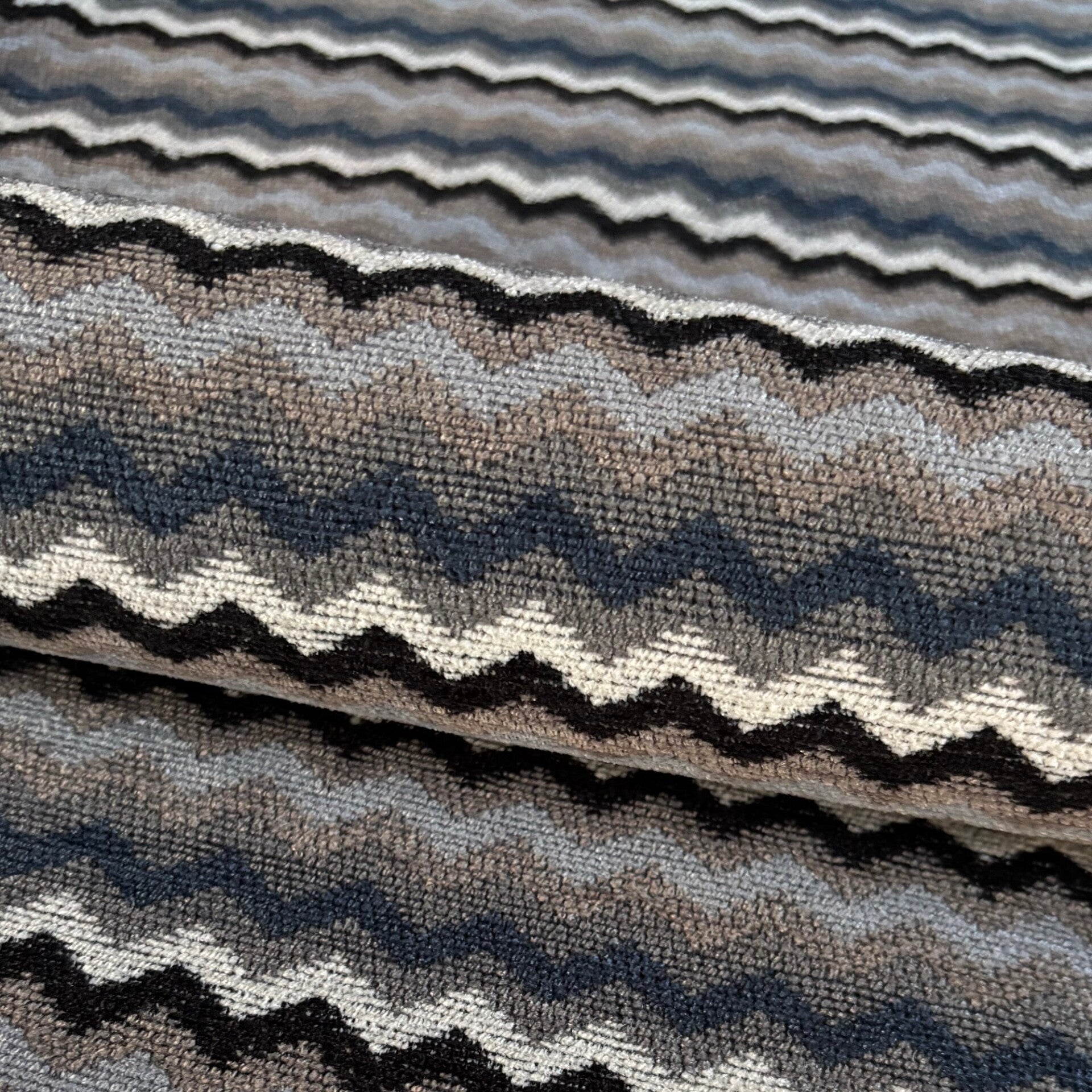 Prijs per meter, 1,4m breed, polyester, blauw zwart wit grijs, iets stevige dikke meubestof, 14m voorraad