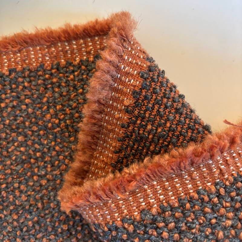1,15m lang, 1,4m breed met een hoekje er uit van 10x10cm, 28% acryl, 24% katoen en 20% rayon, 16% wol en 12% polyester, oranje grijs