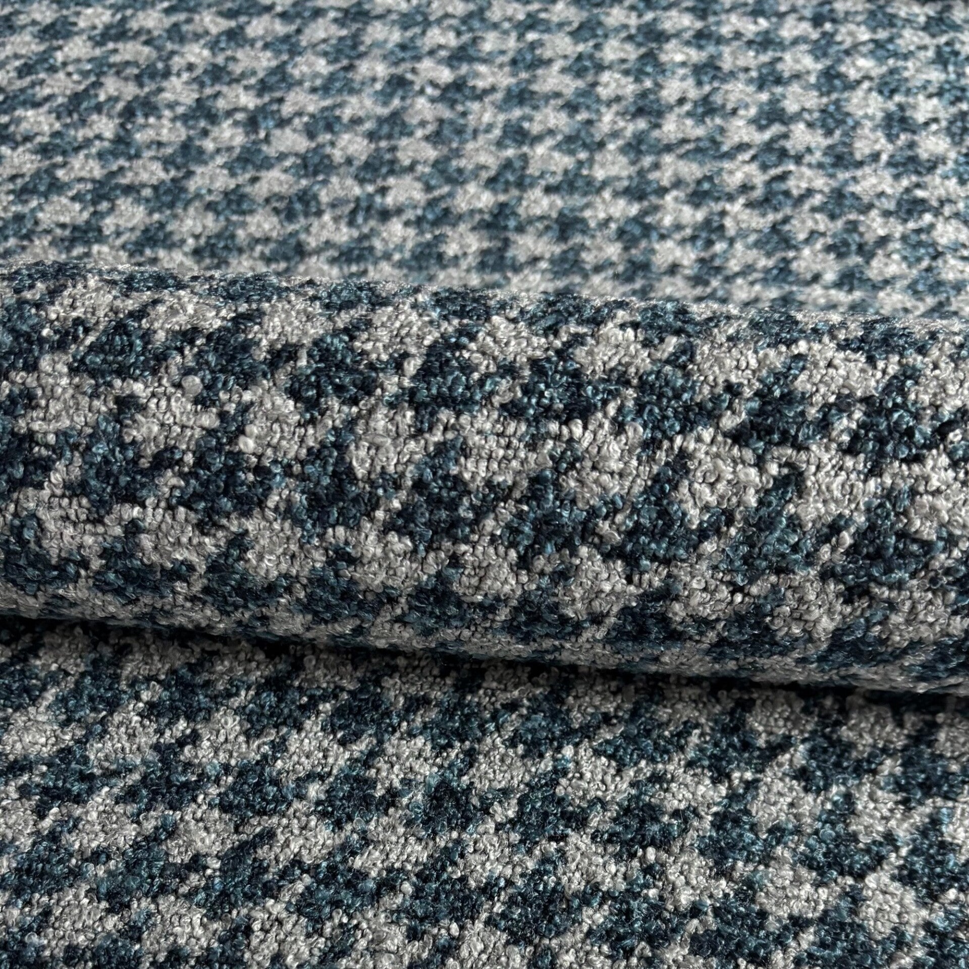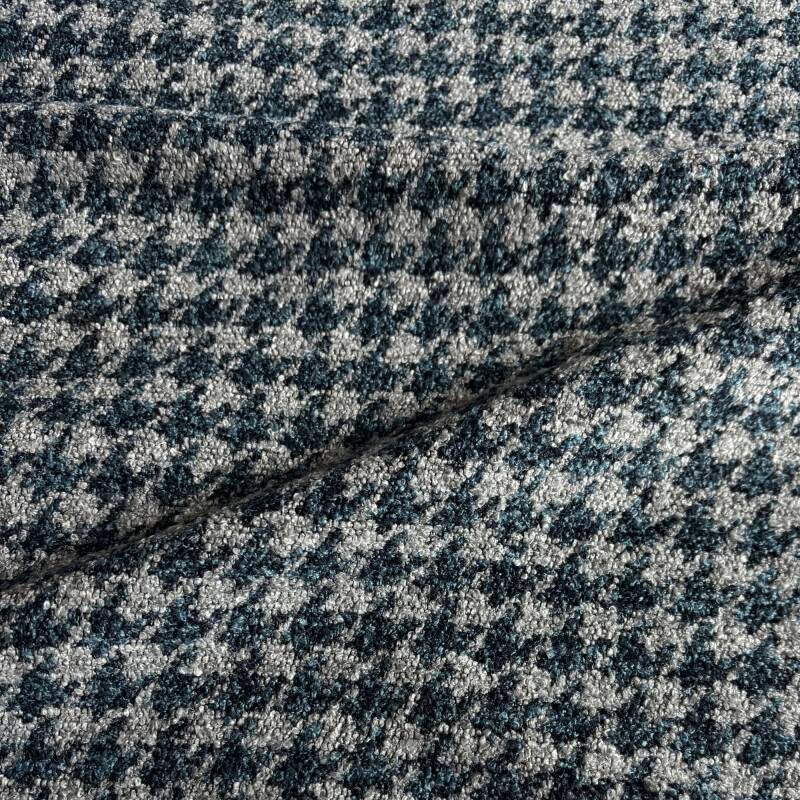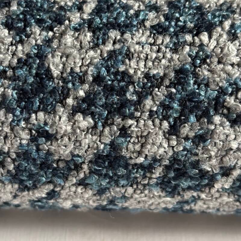 1,09m lang, 1,4m breed, 80% polyester, 20% viscose, oogt als wol blauw grijs pied de poule
