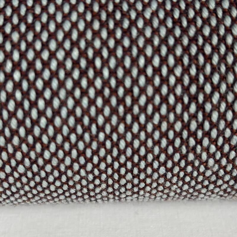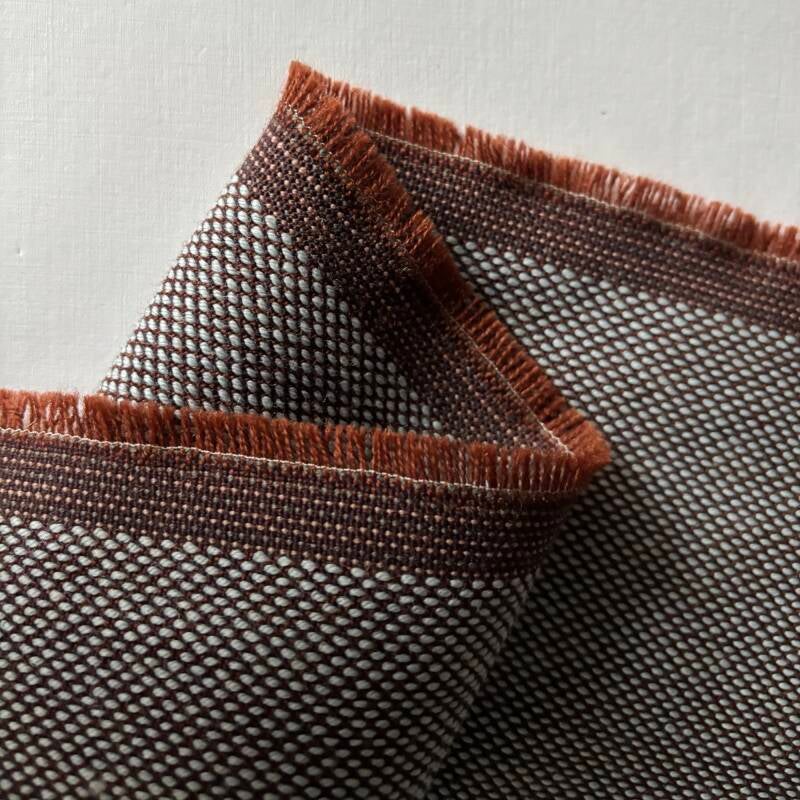 0,82m lang, 1,4m breed met een stuk er aan van 0,53m breed en 0,66m lang en daar een stuk aan van 0,68m breed en 0,77m lang, 90% wol, 10% nylon lichtgrijs op roodbruine ondergrond