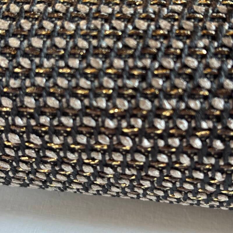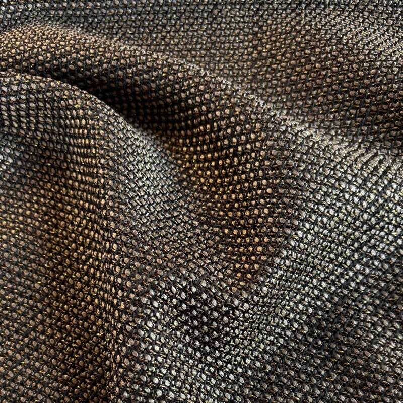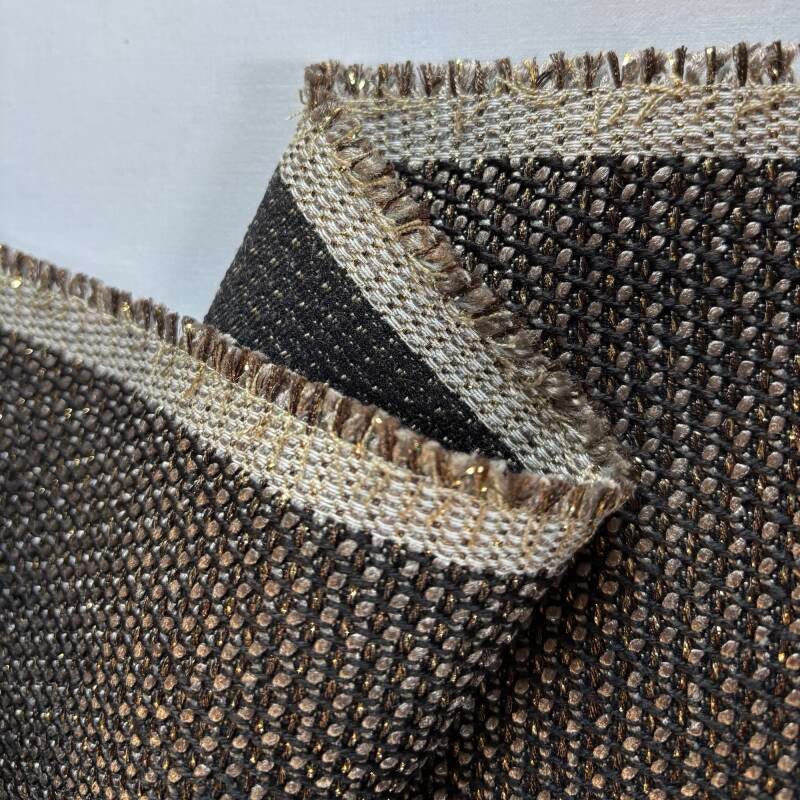 3,0m lang, 1,45m breed, 70% Fire-retardant Polyester29% Trevira CS Polyester 1% Metallic Fiber, bruin zwar met gouden draad