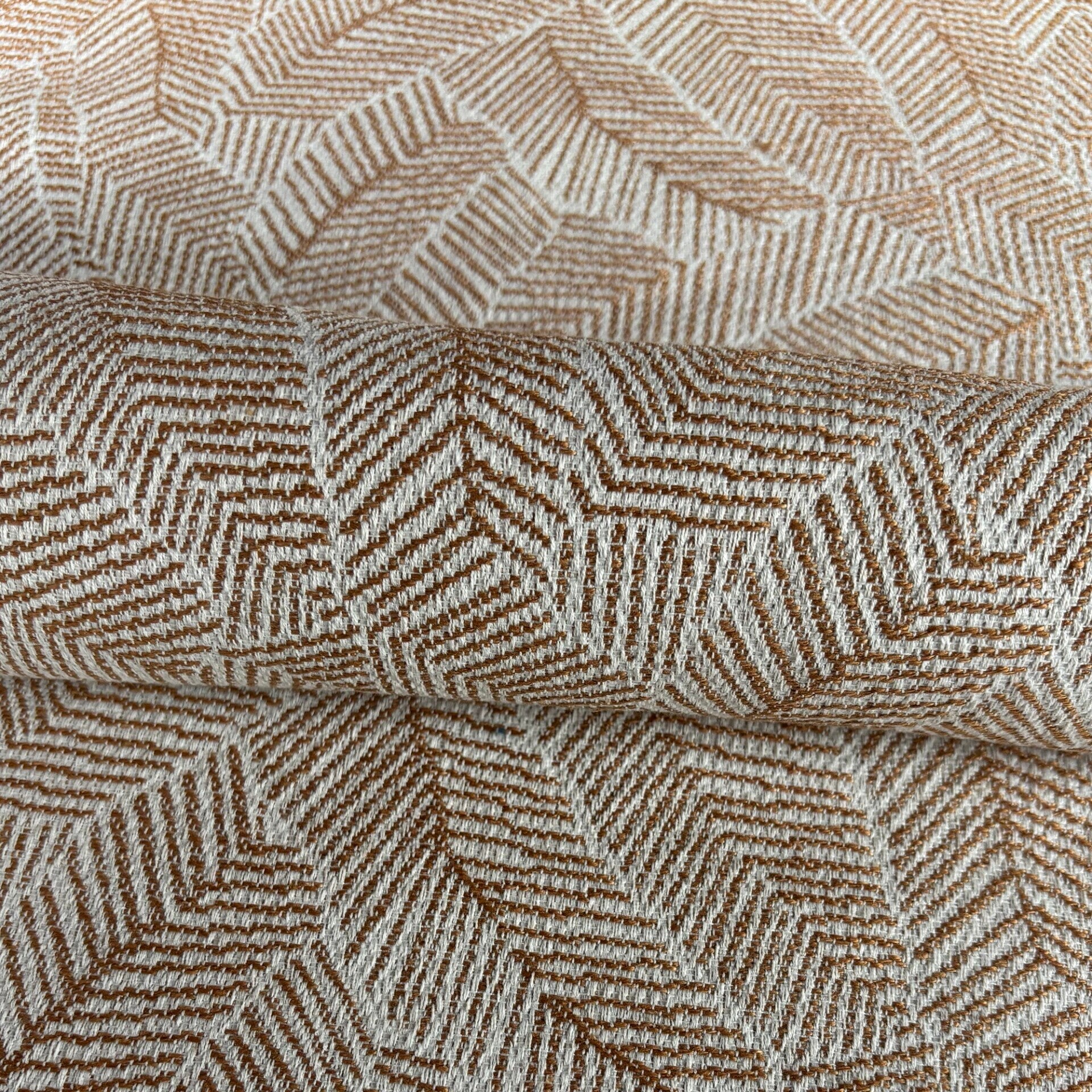 0,53m lang, 1,4m breed met stuk er aan van 0,61m breed en 2,0m lang, 51% hemp, 49% polyester, oranjebruin wit