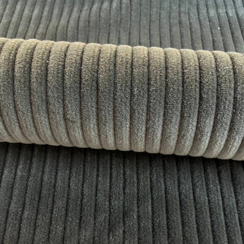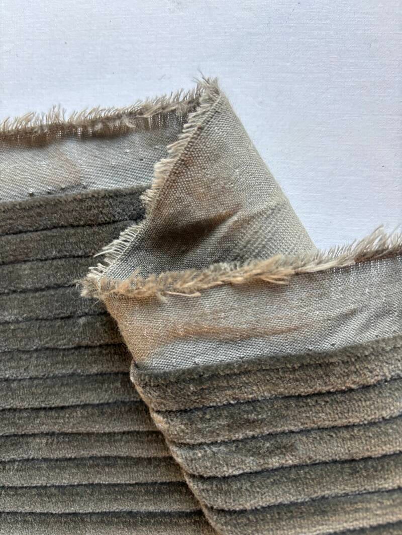 1,8m lang, 1,4m breed, 100% katoen, exclusieve ribvelours, brede rib grijsgroen, verder op deze pagina staat nog een coupon van deze stof