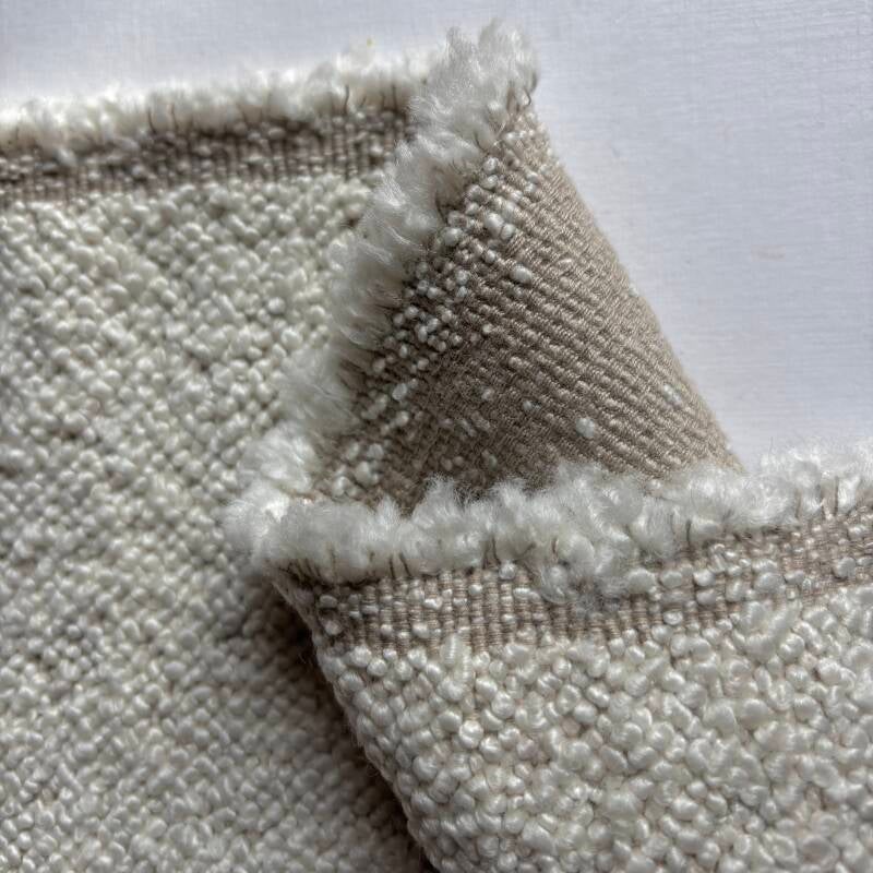 1,35m lang, 1,28m breed met aan 1 kant een stuk van 0,45m breed en 0,85m lang en aan de andere kant een stuk van 0,51m breed en 0,6m lang, 42% wol, 32% viscose, 24% katoen, 1% PA, boucle wit